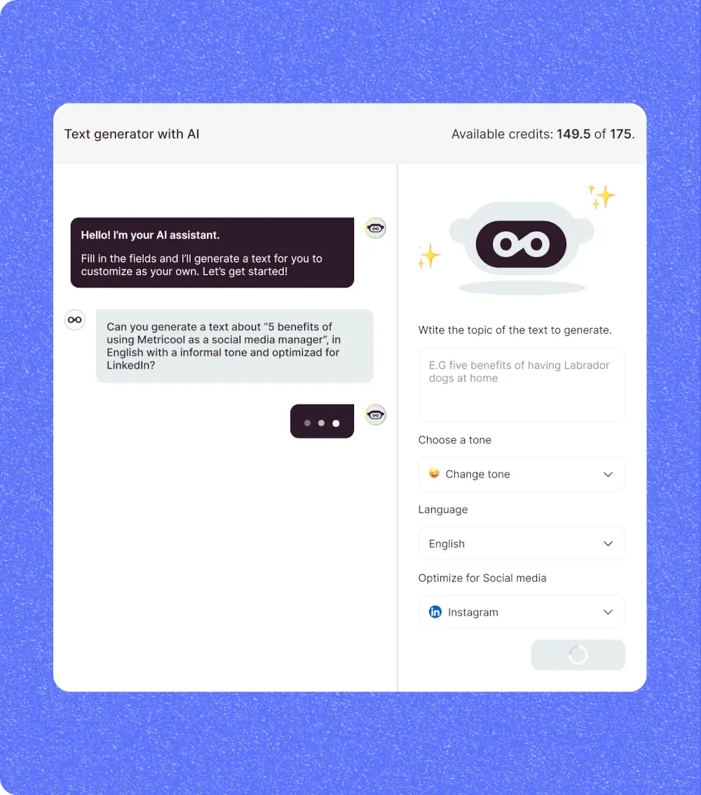 With Metricool, you have an AI assistant that thinks like you and writes for you. By the time you make a coffee, your content will be ready to post.