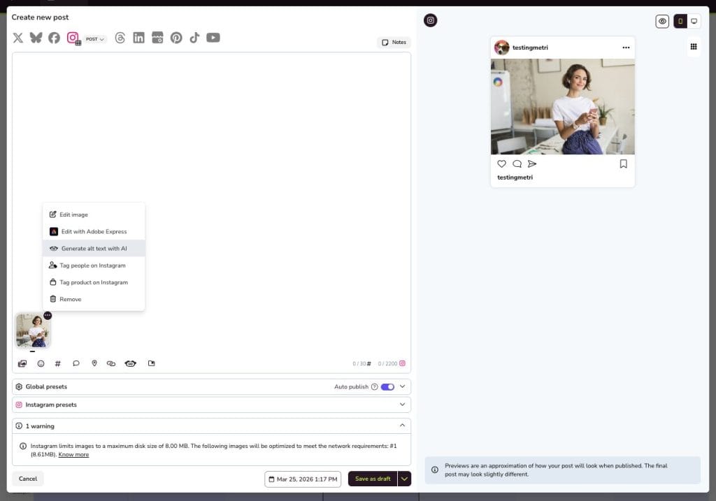 - Cross Platform Publishing: Use alt text across Instagram, Facebook, Threads, LinkedIn, Pinterest, and X without repeating manual work.