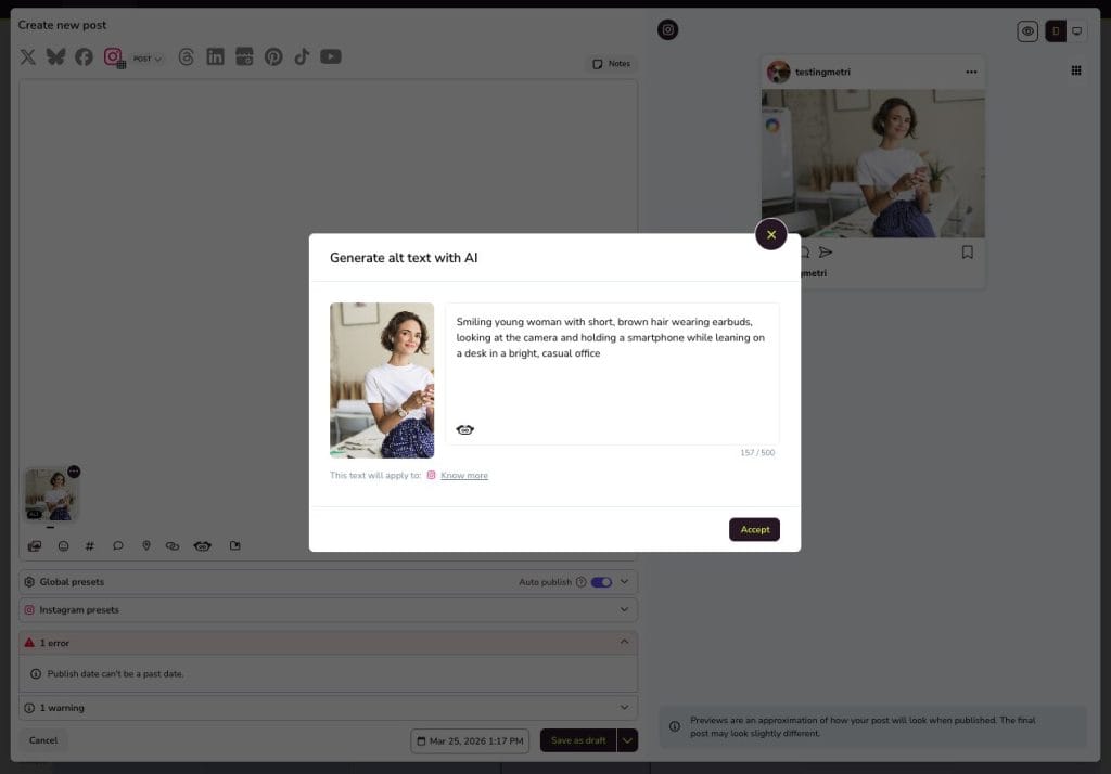 If you publish often, using Metricool’s AI alt text generator helps you stay consistent without slowing down your workflow.