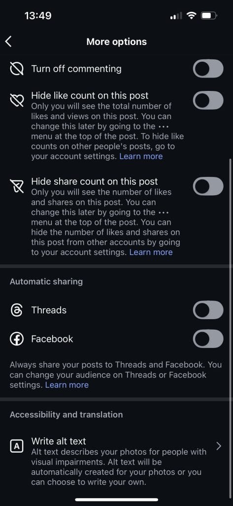 Alt text works quietly in the background. It’s not visible in the caption or on the post itself. Screen readers use it to describe images to people with visual impairments.