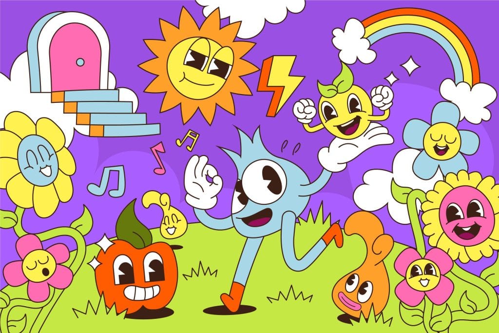 ✅ Improved: Cheerful cartoon: blue spiky character dancing with smiling sun, happy flowers, grinning apple and fruit beneath a rainbow and clouds.