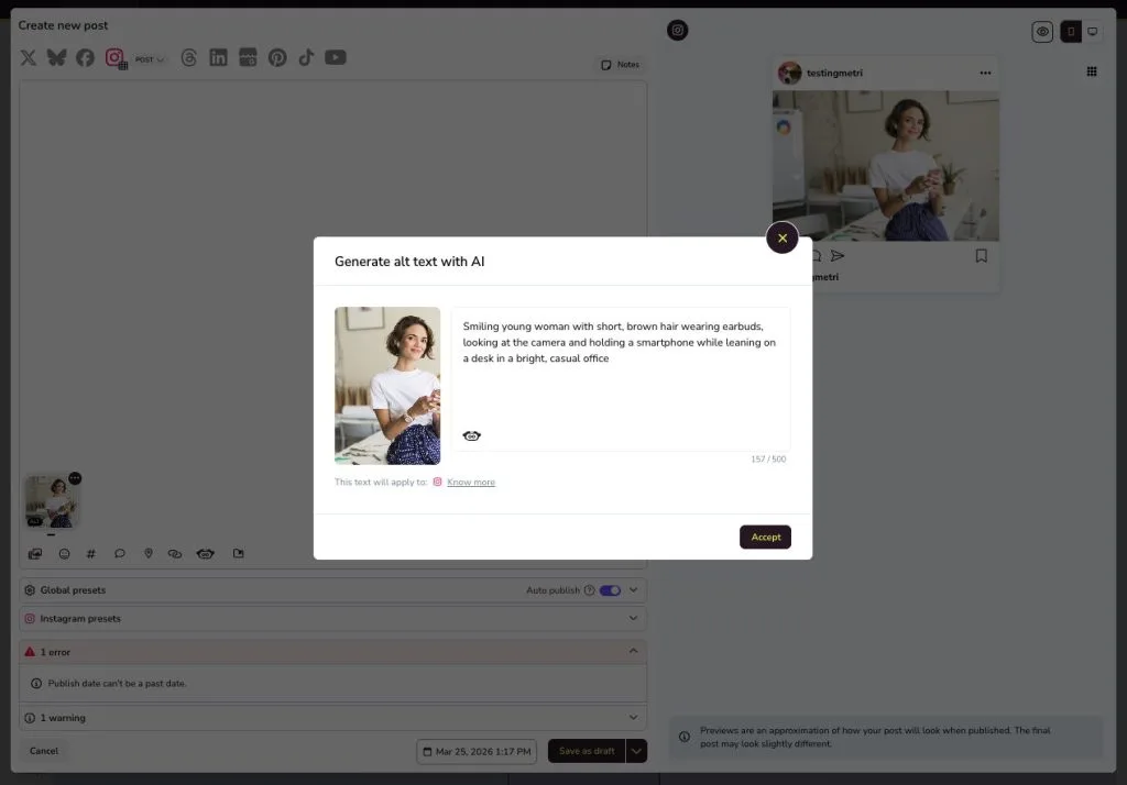 - Cross Platform Publishing: Use alt text across Instagram, Facebook, Threads, LinkedIn, Pinterest, and X without repeating manual work.