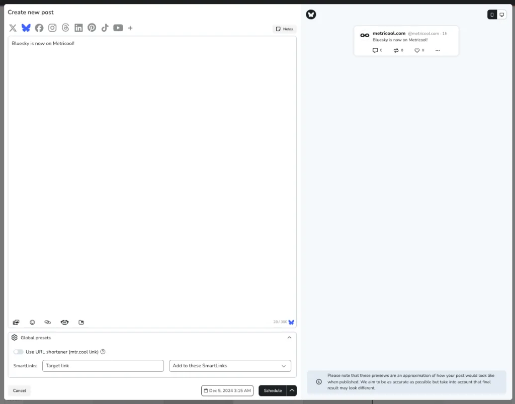While scheduling content on Bluesky was our first priority, we’re already hard at work developing analytics for Bluesky. Soon, you’ll be able to track performance, analyze audience behavior, and fine-tune your content strategy using data-driven insights—all within Metricool. Stay tuned for these powerful tools that will elevate your social media game!