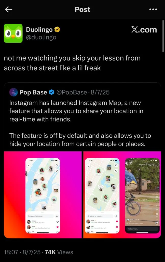 Duolingo brings humor and personality to social media through its mascot, Duo. They create viral TikTok and Instagram Reels featuring Duo in playful or trending scenarios and interact with followers through witty comments and pop culture references. Their approach makes content highly shareable while reinforcing a fun, approachable identity.