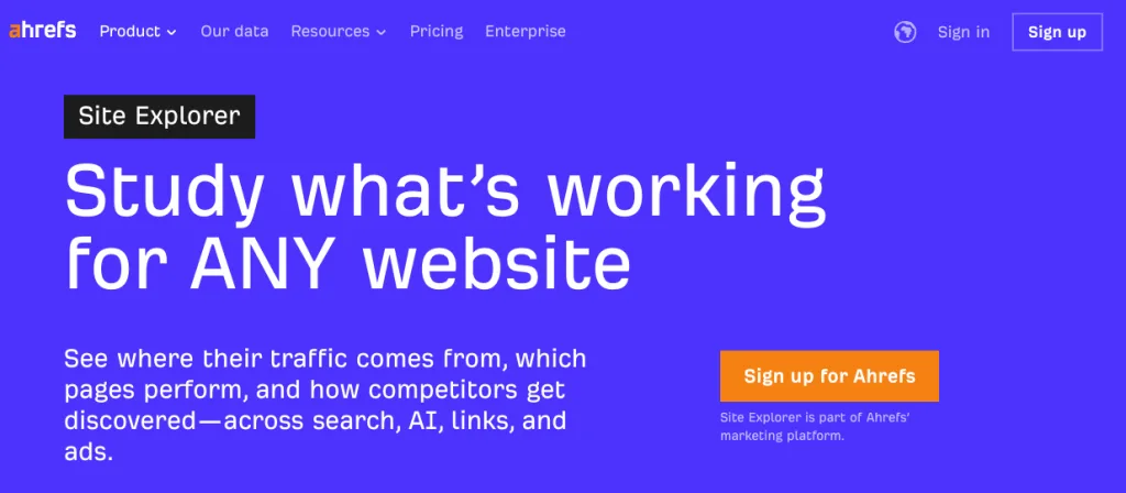 Ahrefs gives you a clear view of what’s driving success for any website. From traffic and top-performing pages to backlinks and paid campaigns, it helps you understand how competitors get discovered and what’s working for them (or what isn’t) so you can make smarter decisions for your own content and strategy.