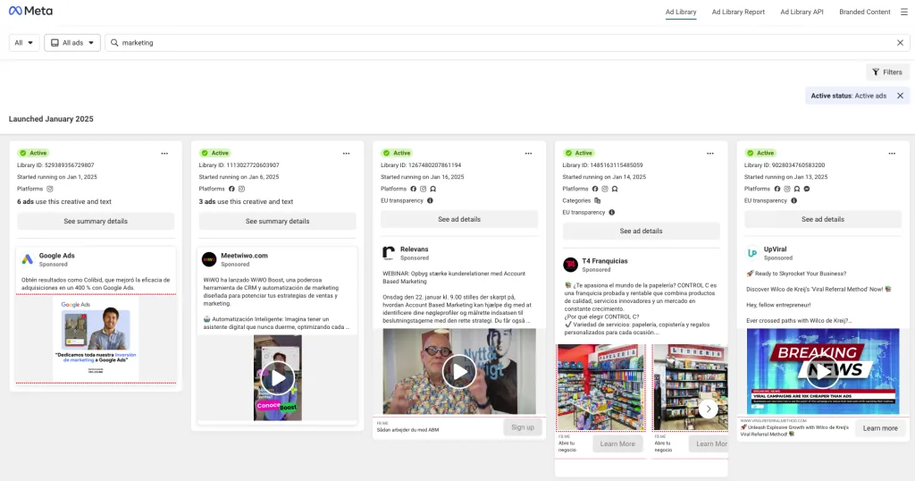 The Ad Library is a treasure trove of insights, enabling you to study active campaigns from competitors and industry leaders. Whether you’re looking for some inspiration, monitoring trends, or refining your own strategy, this tool gives you a behind-the-scenes look at the creative, messaging, and targeting approaches used by others in your niche.