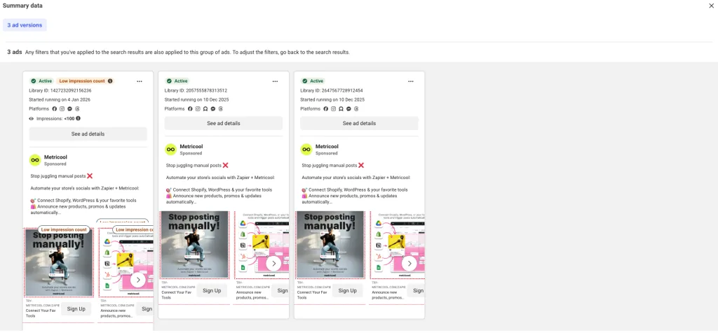 The Ad Library also groups variants under shared campaigns, which makes testing behavior easier to spot. When brands run many versions of the same message, it usually signals ongoing experimentation or automation.
