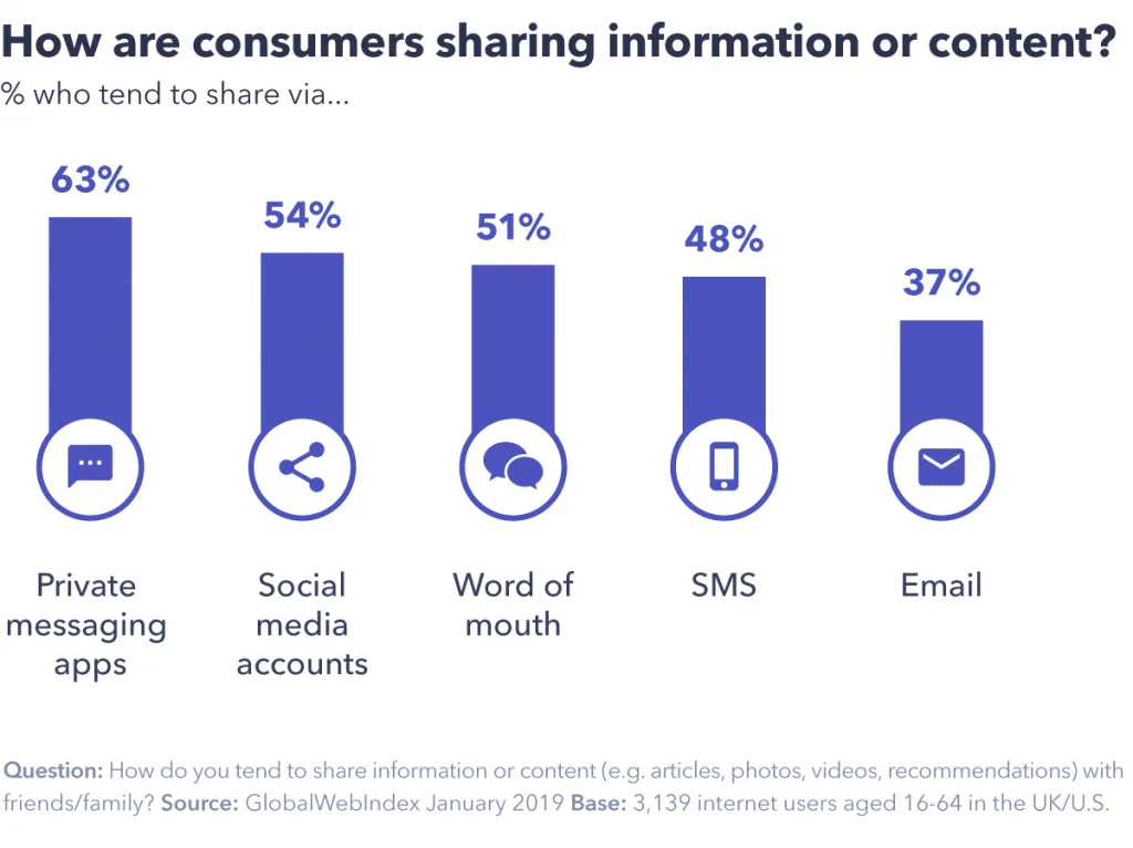People are more likely to share content in private spaces than on public social media. According to Global Web Index, 63 percent of consumers prefer messaging apps like WhatsApp or Messenger when sharing online, compared to 54 percent who use open social platforms.
