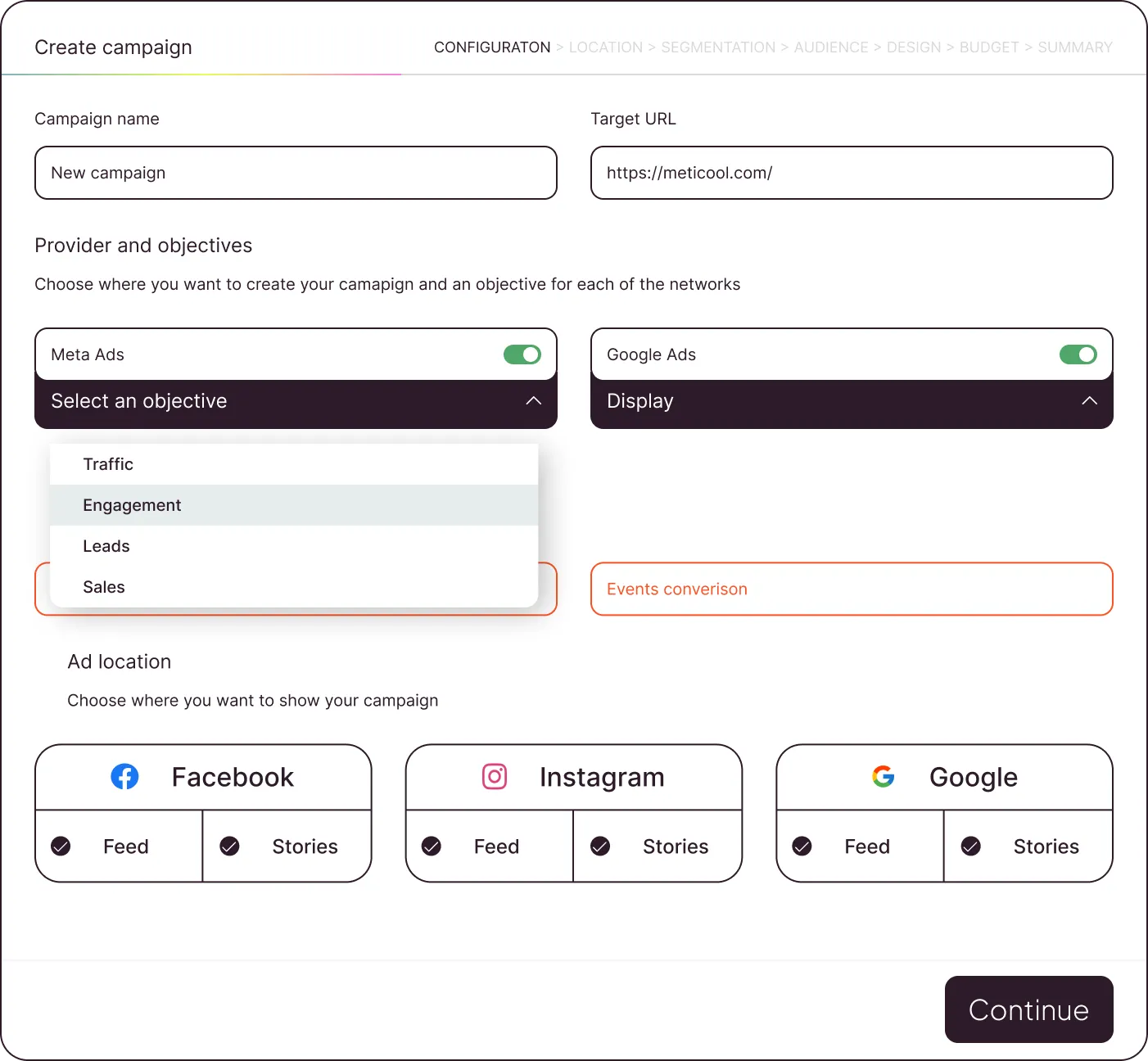 Kampagnen erstellen war noch nie so einfach. Schritt für Schritt legst du deine Ziele fest, wählst Zielgruppen aus und richtest deine Google- und Facebook-Ads direkt an einem Ort ein. Produkt bewerben? Mehr Traffic für deine Website? Mehr Verkäufe? Kein Problem – wir führen dich durch den Prozess, damit nichts dem Zufall überlassen bleibt.