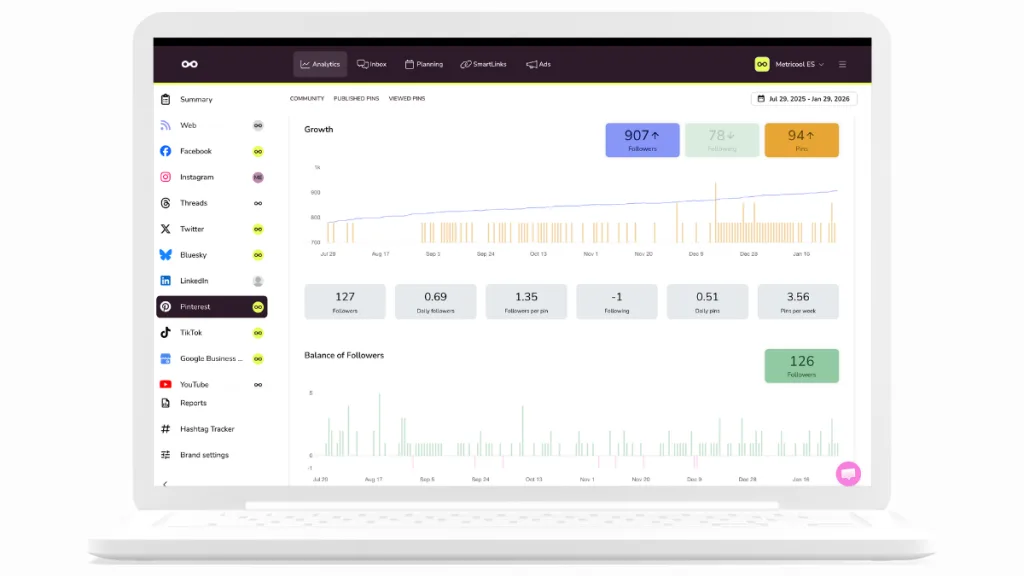 Mit Metricool planst du deine Pins im Voraus, analysierst ihre Performance und behältst alle wichtigen Daten an einem Ort.
