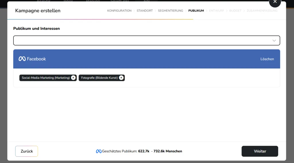 - Interessen hinzufügen → die Reichweite wird in Echtzeit aktualisiert