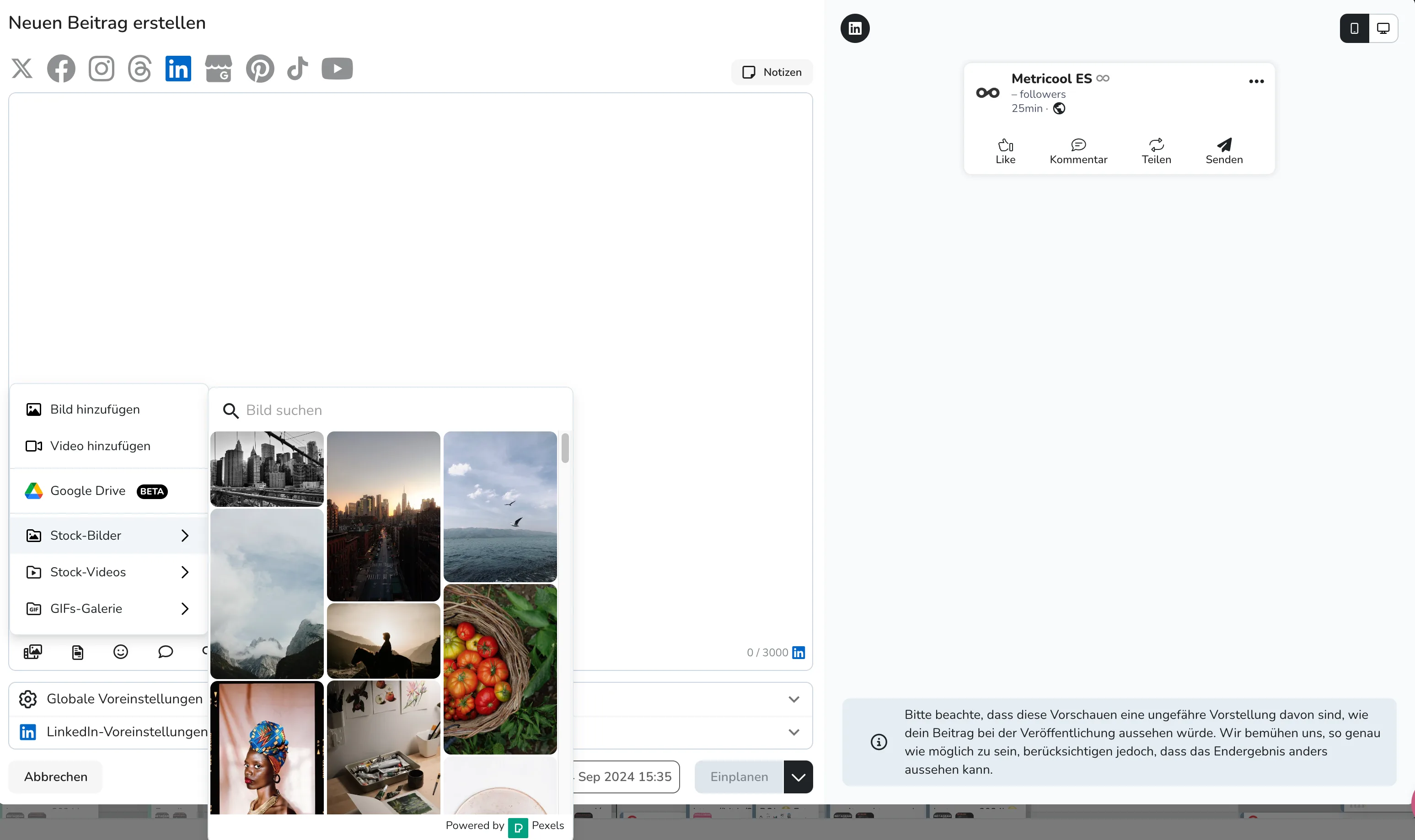 Die Bilddatenbank in Metricool erleichtert dir die Content-Erstellung direkt in der App. Du musst nicht auf eine andere Website gehen, um Multimedia-Inhalte zu suchen – alles, was du brauchst, ist in Metricool integriert.