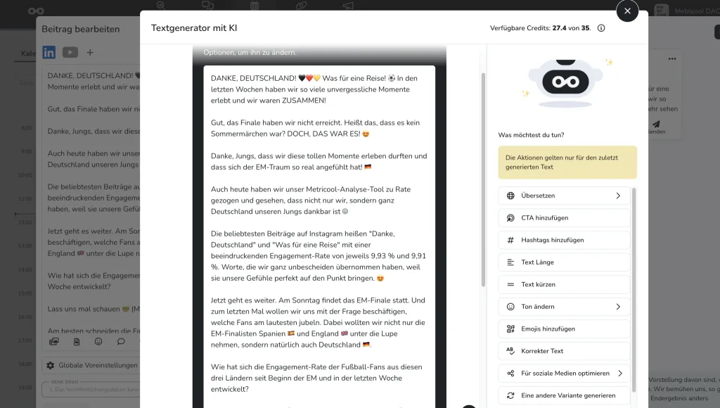 Das Beste daran? Die KI-Funktionen von Metricool sind kostenlos nutzbar – perfekt für alle, die professionelle Social-Media-Inhalte erstellen möchten, ohne in teure KI-Tools investieren zu müssen.