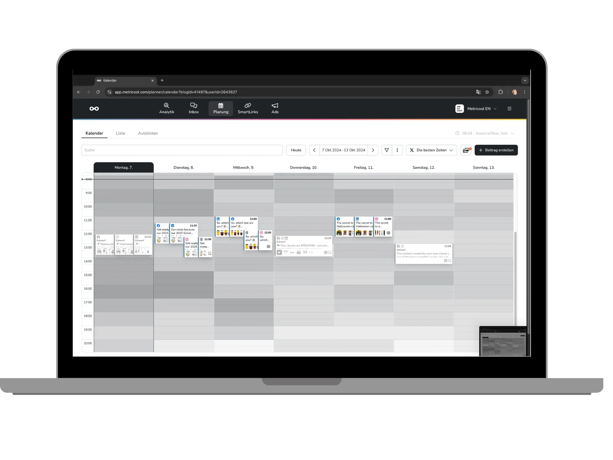 💡 Tipp: Du willst deine überarbeiteten Inhalte nicht nur speichern, sondern direkt posten oder einplanen? Mit Metricool geht das ganz einfach: Du ziehst deinen Content in den Kalender, legst das Veröffentlichungsdatum fest – und fertig. Alles an einem Ort.