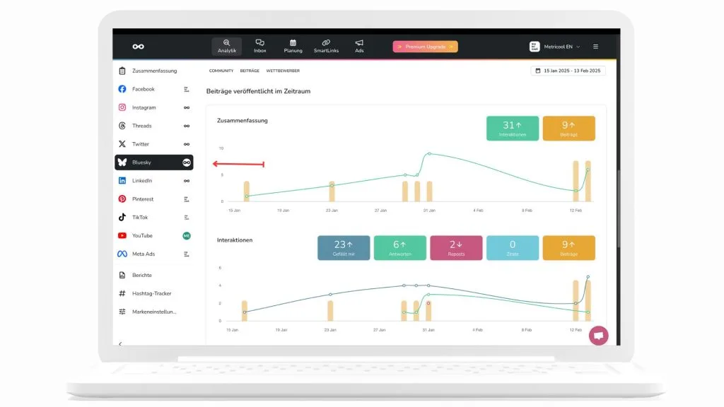Mit dem leistungsstarken Bluesky-Analytics-Tool von Metricool kannst du dein Engagement überwachen, Trends erkennen und datenbasierte Entscheidungen treffen, um deine Strategie zu optimieren.