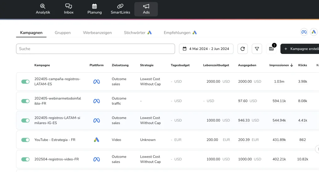 Hier kannst du alle Kampagnen mit vollständigen Informationen sehen. Wenn du auf jede einzelne klickst, wird ein Dropdown-Menü angezeigt, in dem du weitere Informationen zu folgenden Punkten findest: