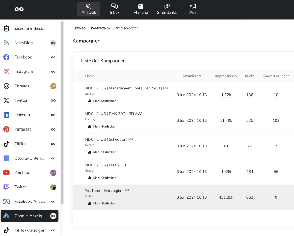 Diesmal musst du auf Kampagnen klicken, und du bekommst die folgende Tabelle angezeigt: