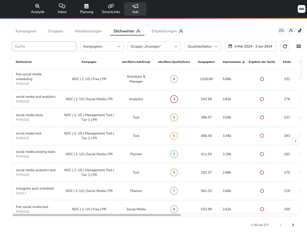 Neben der Verwaltung deiner Online-Kampagnen mit Metricool kannst du auch den Quality Score deiner Google-Ads-Kampagnen und Anzeigengruppen erfahren.