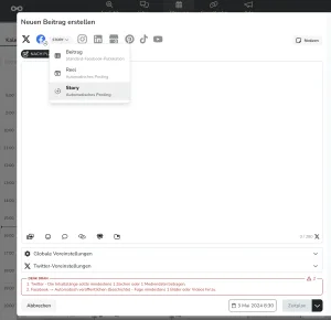 - Wähle Facebook und/oder Instagram und den Beitragstyp „Stories“.