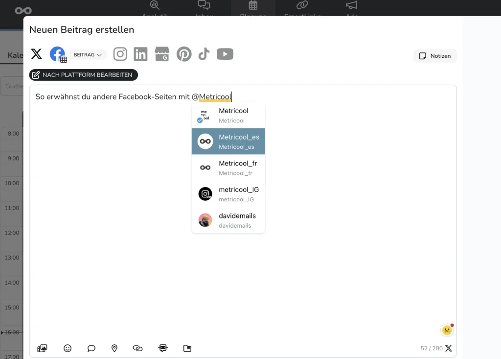 Der Planer von Metricool zeigt eine Liste aller Seiten an, während du tippst, und du kannst einfach diejenige auswählen, die in deinem Beitrag erwähnt werden soll.