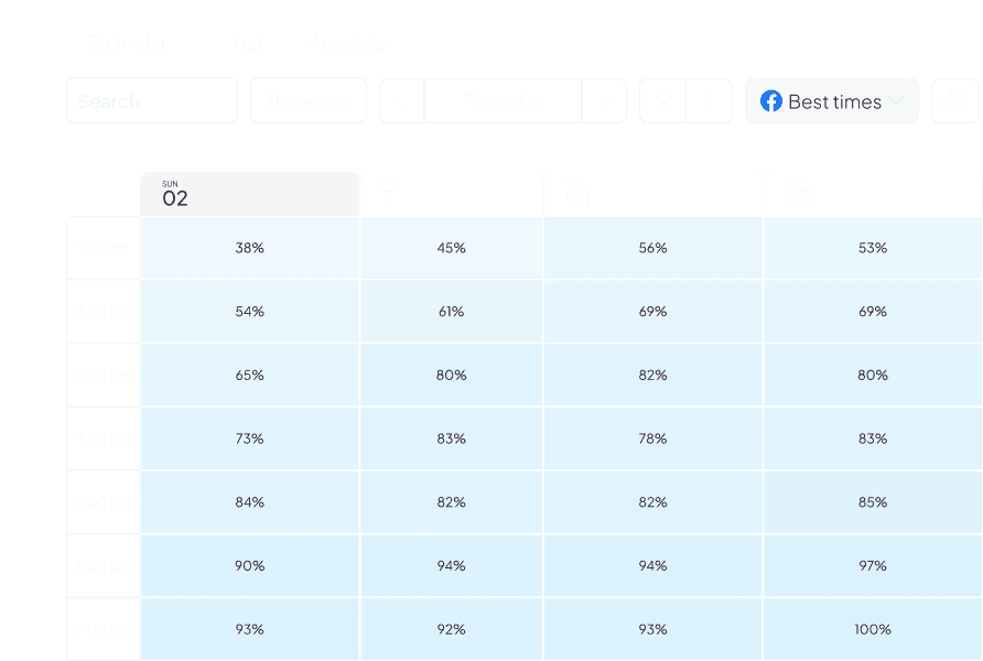 Schließe die Content-Planung für Facebook in wenigen Minuten ab. Erstelle Posts, Stories, Reels und Karussells und poste sie genau dann, wann deine Community am aktivsten ist. Ob KI-gestützt oder komplett automatisiert – mit Metricool sparst du Zeit bei jedem Schritt.