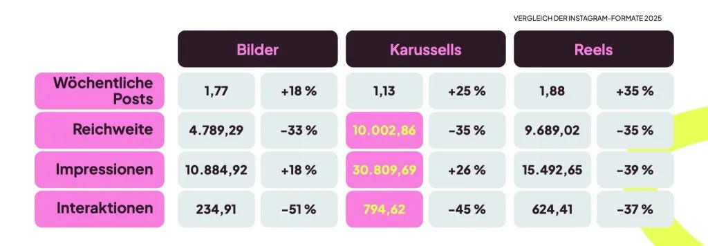Dennoch zeigen Daten für 2026 klare Trends: Karussell-Posts erzielen im Feed oft die höchste Engagement-Rate, weil Nutzer länger mit ihnen interagieren. Reels sind das stärkste Format für Reichweite und das Erreichen neuer Zielgruppen. Stories sind ideal für Community-Building und enge Verbindungen. Einzelne Fotos funktionieren weiterhin gut, wenn sie hochwertig sind und eine starke Caption haben.
