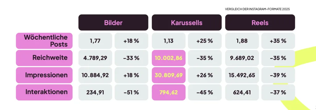 Während viel über Videoformate gesprochen wird, zeigen die Daten 2026 ein etwas anderes Bild. Karussells gehören weiterhin zu den leistungsstärksten Formaten auf Instagram. Sie werden zwar seltener gepostet als Reels oder Stories, liefern aber erstaunlich konstant starke Ergebnisse.