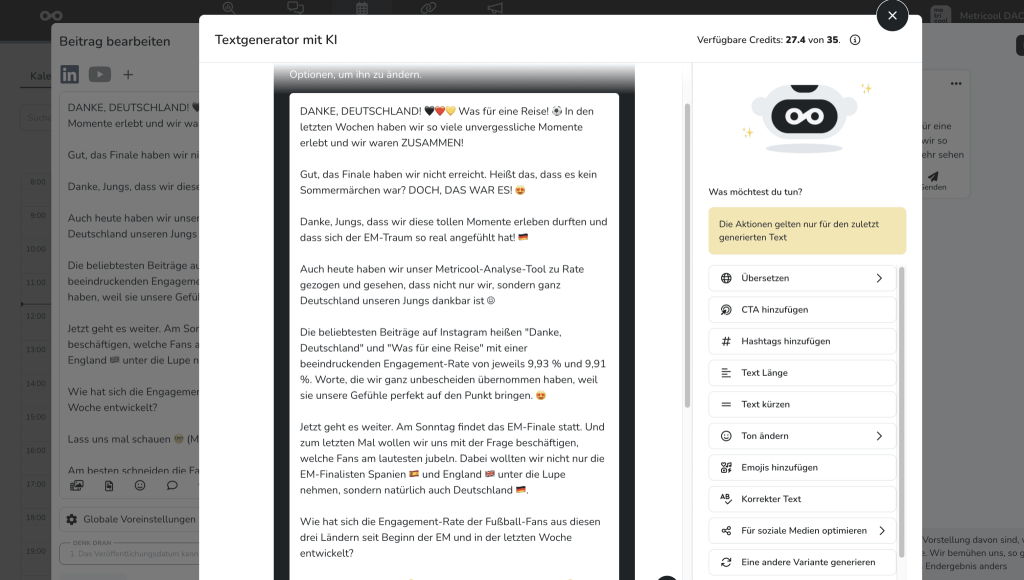 Die integrierte KI-Funktion ist ein Social-Media-Assistant, der deine Arbeit enorm erleichtert. Anstatt Ideen in einem externen Generator zu sammeln, schreibst du deine Posts direkt in Metricool – und die KI hilft dir, Texte zu erstellen, zu optimieren und für jede Plattform anzupassen.