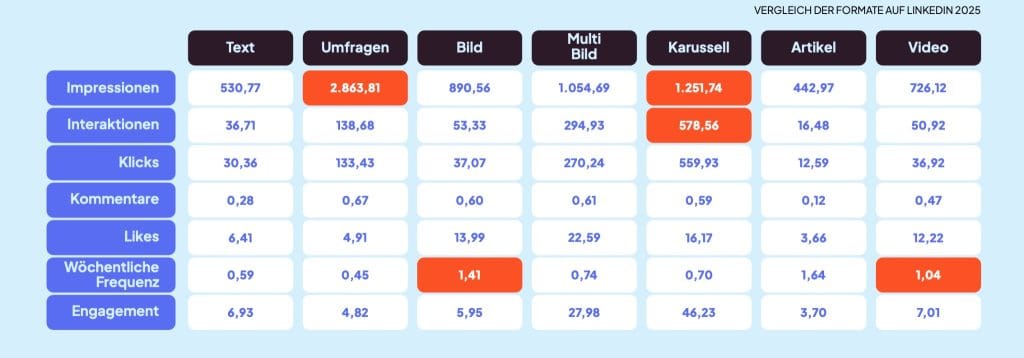 Unsere Daten zeigen, dass Karussells (als PDF hochgeladen) häufig besonders hohe Impressionen erzielen, weil sie Interaktion und Verweildauer fördern. Das heißt aber nicht, dass andere Formate nicht funktionieren – entscheidend ist der Kontext deines Inhalts.