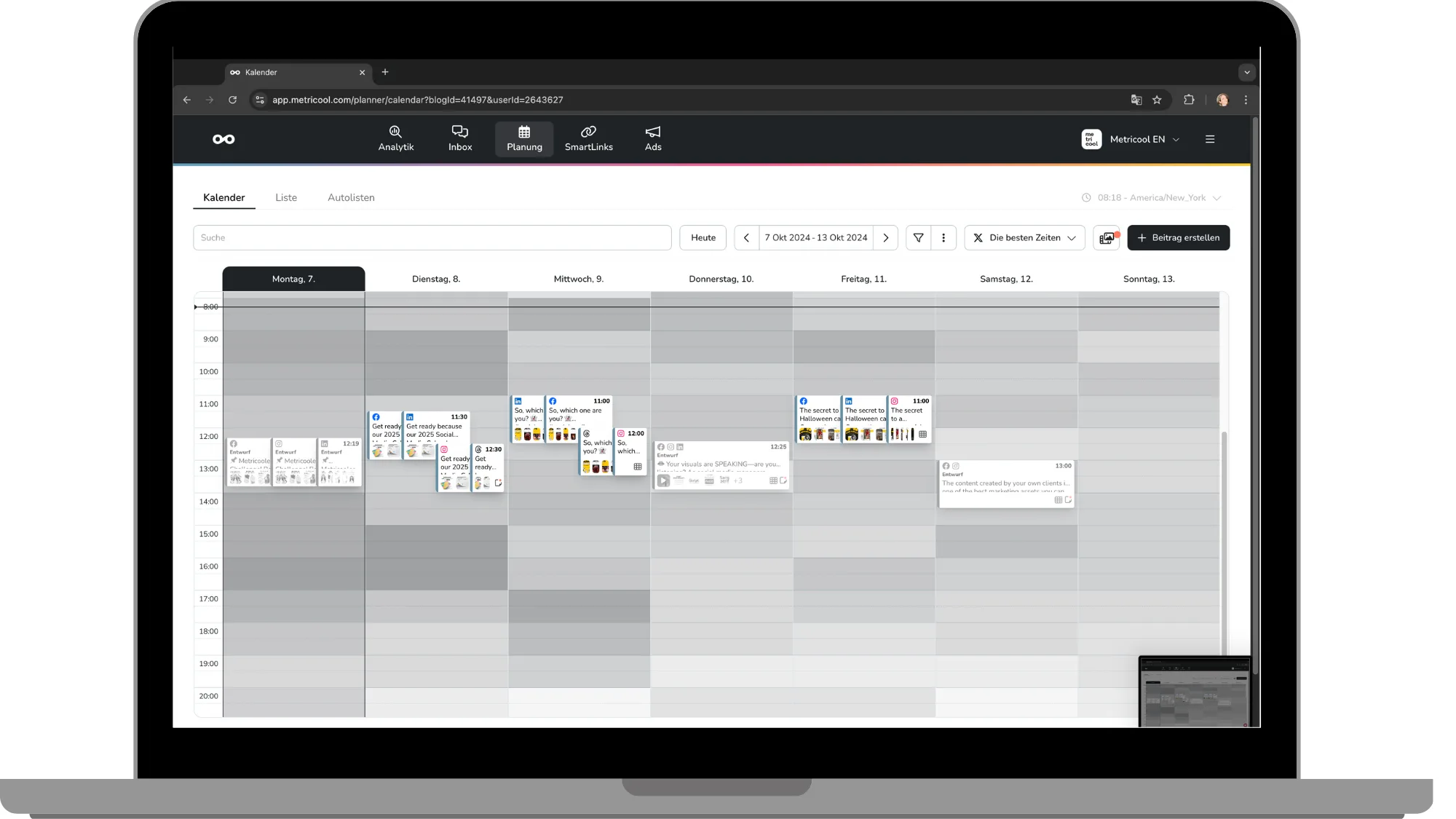 Mit Metricool hast du die Möglichkeit, deine Beiträge Monate im Voraus zu planen und zur besten Zeit zu veröffentlichen – und das ganz einfach und automatisiert.