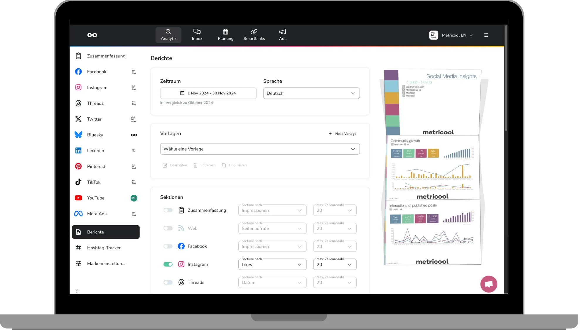Maßgeschneiderte Instagram-Berichte mit Metricool