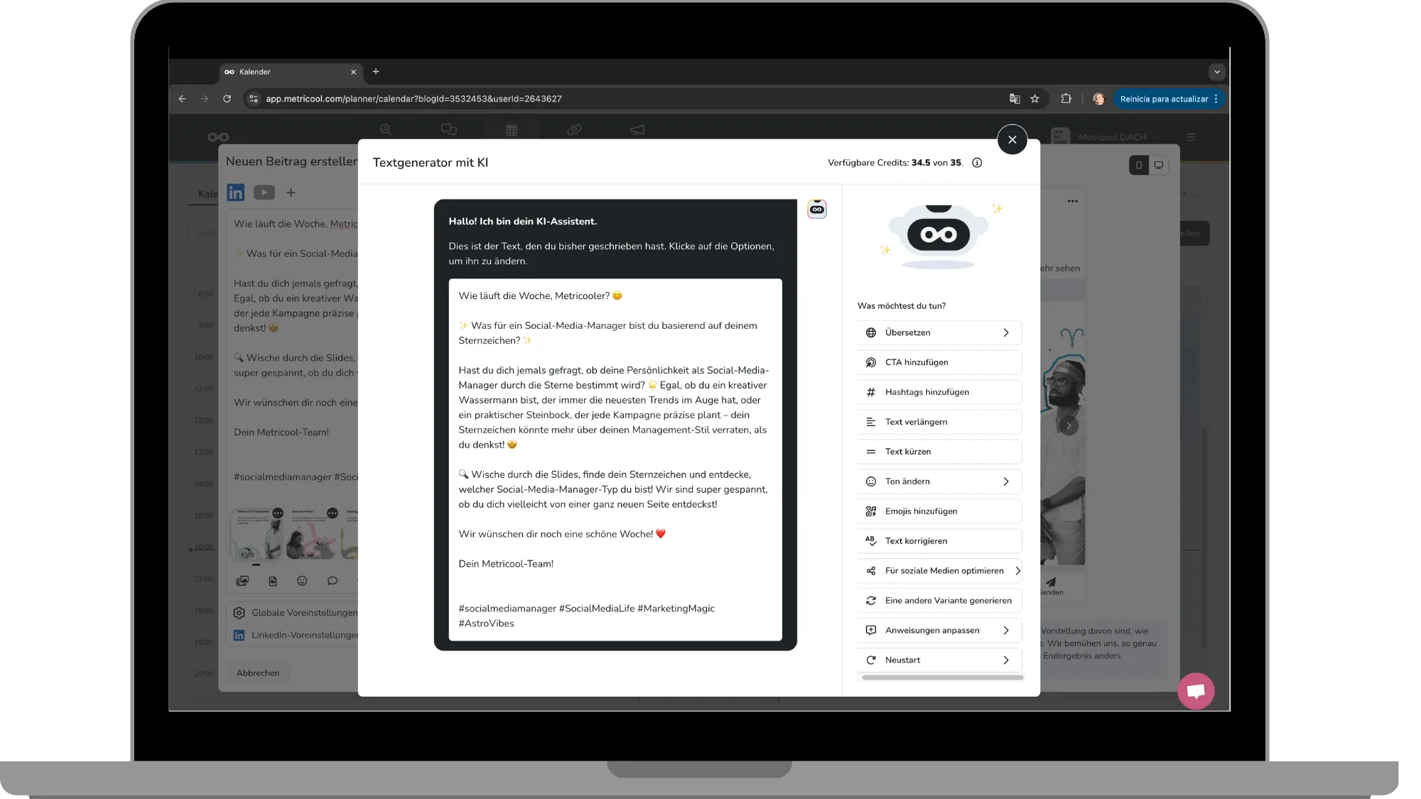 Ja, mit der KI von Metricool kannst du deine Beiträge übersetzen lassen. Ist das alles? Keineswegs.