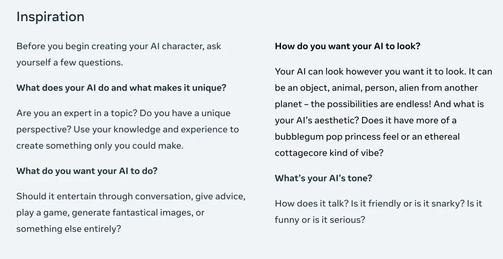 ⚡️Bei der Gestaltung deiner eigenen virtuellen Persönlichkeit kannst du ihren Namen, das Aussehen, die Persönlichkeit und den Ton festlegen. Hier kannst du dich kreativ austoben: Deine KI kann eine Person, ein Tier oder ein Alien sein. Was immer du brauchst und möchtest, Meta hat dafür gesorgt, dass du es erstellen kannst.