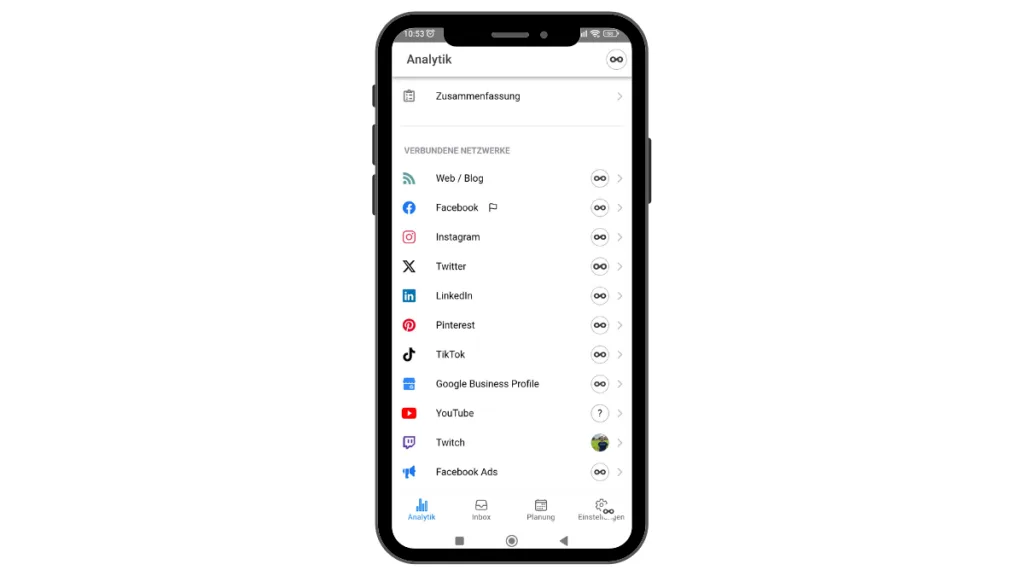 Mit der Inbox in der App kannst du alle Kommentare und Nachrichten von Instagram, Facebook, Twitter, TikTok, YouTube, LinkedIn und Bewertungen von Google Business Profile verwalten.