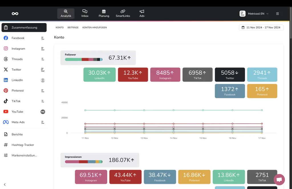 Mit Metricool kannst du nicht nur die Performance deiner Website analysieren, sondern auch die Ergebnisse deiner Social-Media-Strategie im Detail auswerten. Zusätzlich hast du die Möglichkeit, Inhalte direkt in Metricool zu planen und dadurch wertvolle Zeit zu sparen.