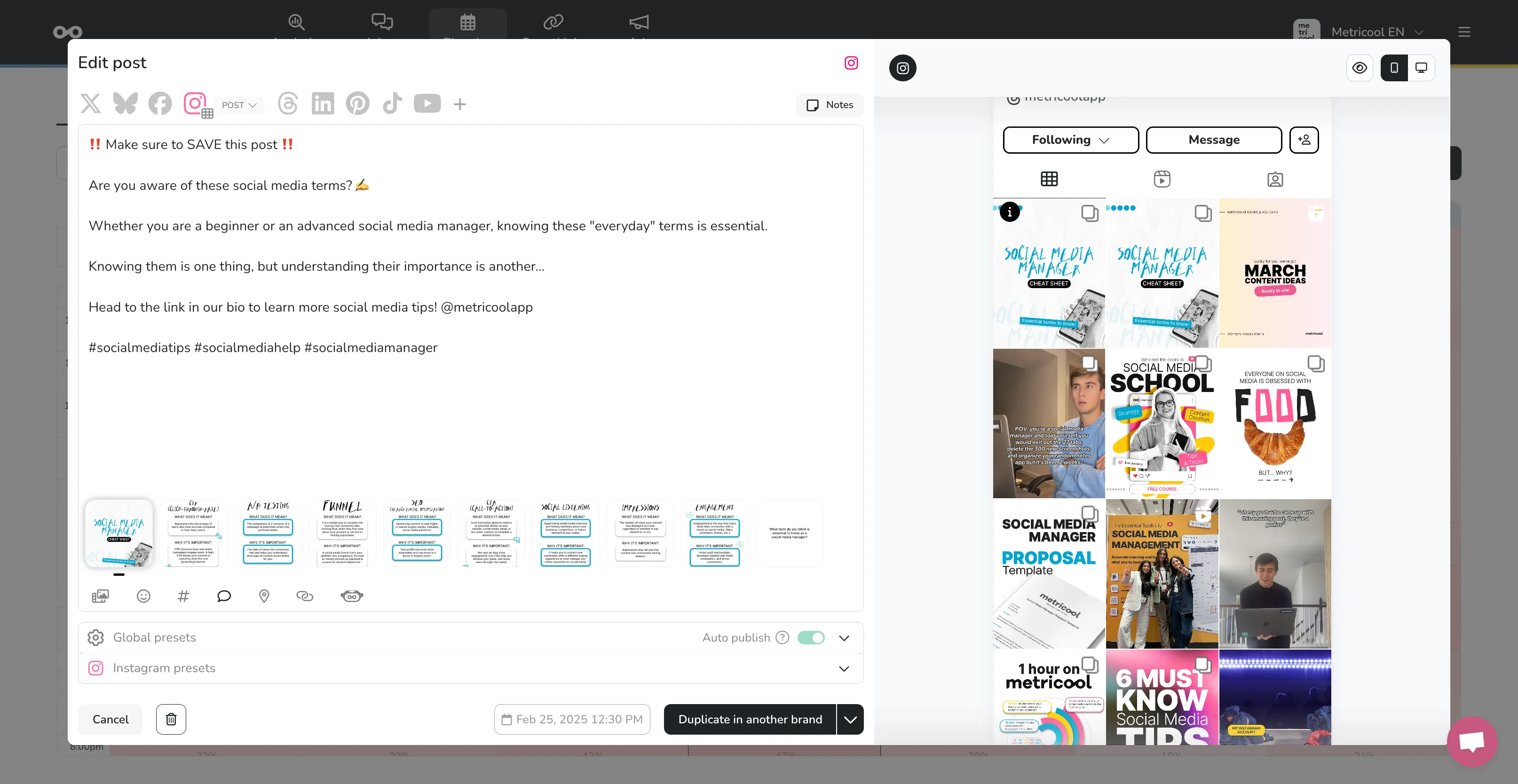 Wenn du mehrere Marken verwaltest und effizient arbeiten möchtest, ist diese Funktion genau das Richtige für dich! Wähle einen Beitrag aus, öffne ihn und klicke auf „Für eine andere Marke duplizieren“. Danach kannst du eine oder mehrere Marken auswählen, auf die der Beitrag übertragen wird – ganz ohne zusätzlichen Aufwand.