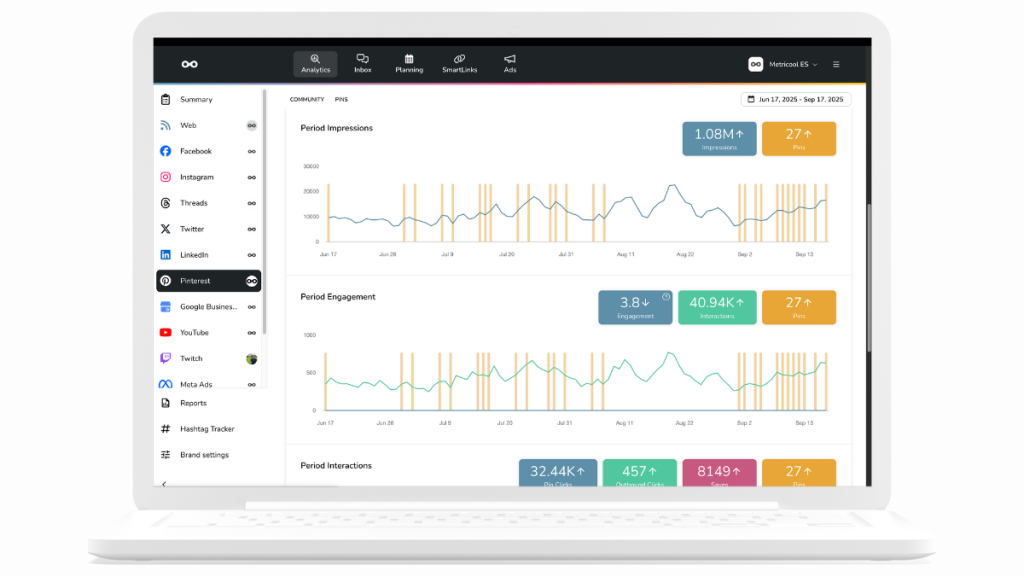 Mit Metricool geht das besonders einfach. Du siehst auf einen Blick, wie sich deine Follower entwickeln, welche Pins performen und wann deine Zielgruppe aktiv ist. So kannst du deine Strategie immer wieder anpassen und perfektionieren 👌