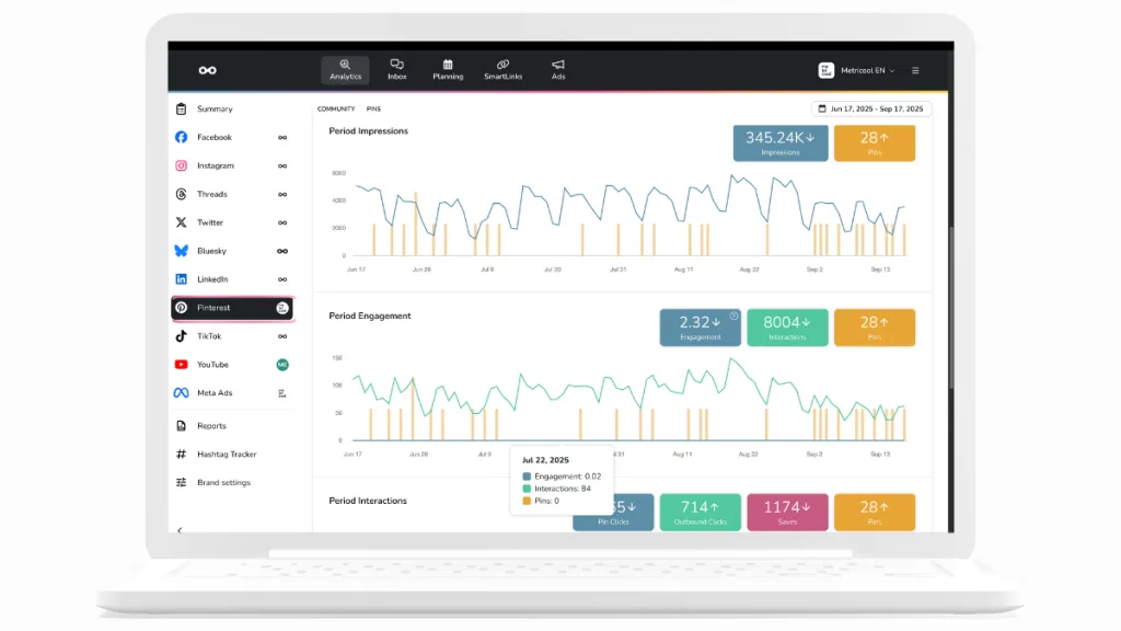 Metricool unterstützt dich dabei, deine Pins vorauszuplanen, automatisiert zu veröffentlichen und die Performance im Blick zu behalten. So kannst du deine Pinterest-Strategie nicht nur einfacher, sondern auch deutlich wirkungsvoller umsetzen.