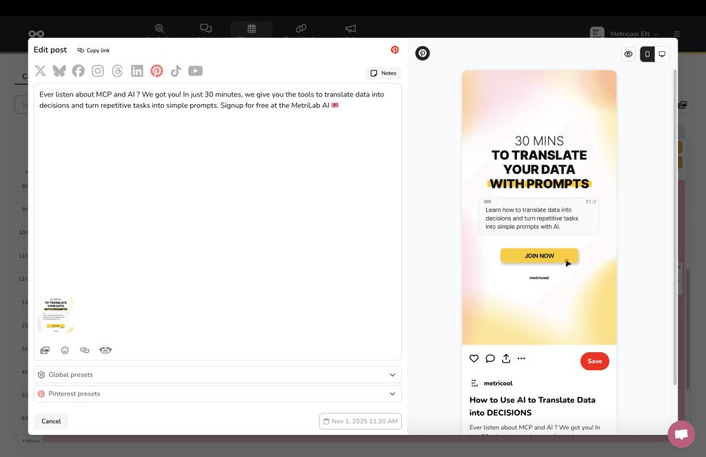 Pinterest bietet eine einfache Planungsfunktion, aber Metricool geht deutlich weiter: