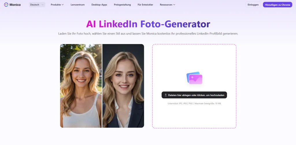 Hier ist alles auf LinkedIn optimiert. Du musst dir keine Gedanken über Outfit, Hintergrund oder Licht machen – Monica übernimmt das für dich und liefert in Sekunden ein professionelles und authentisches Ergebnis.