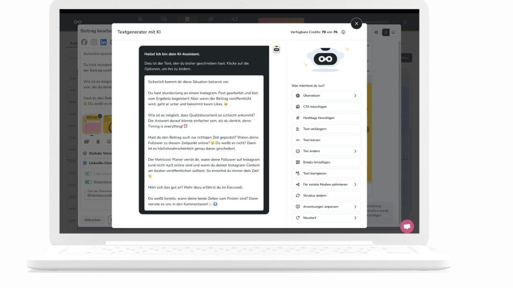 Wenn du gezielt KI für Social-Media-Posts nutzen willst, bietet Metricool einen eigenen KI-Assistenten. Der KI-Social-Media-Assistant hilft dir, Texte zu schreiben, zu optimieren und an stilistisch an jede einPlattformen anzupassen. Auf diese Weise kannst du deine erfolgreichsten Social-Media-Posts für andere Social-Media-Plattform recyceln, ohne es selbst umschreiben und stilistisch anpassen zu müssen.