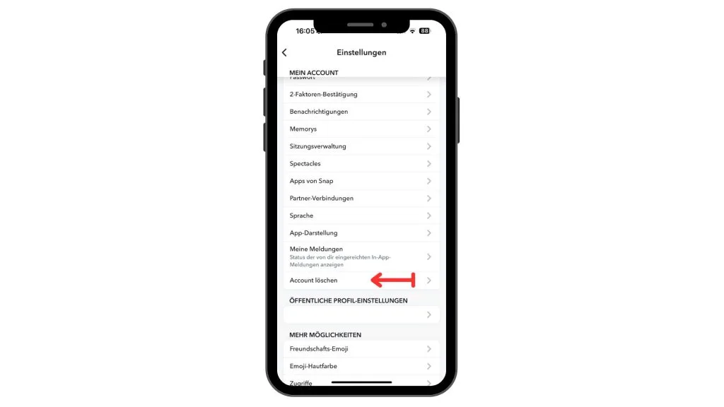 - Scrolle runter zu „Account löschen“ und tippe darauf.
