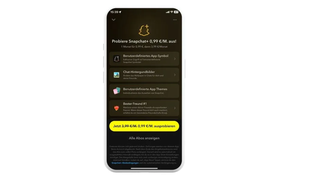 Das Standard-Abo von Snapchat+ kostet monatlich ca. 3,99 €, beachte allerdings, dass die Preise je nach Land variieren können. Um sicherzugehen, kannst du dir den aktuellen Preis direkt in deinen Snapchat-Einstellungen unter „Snapchat +“ ansehen 👇