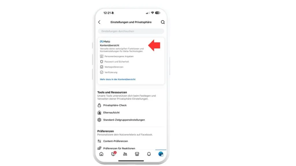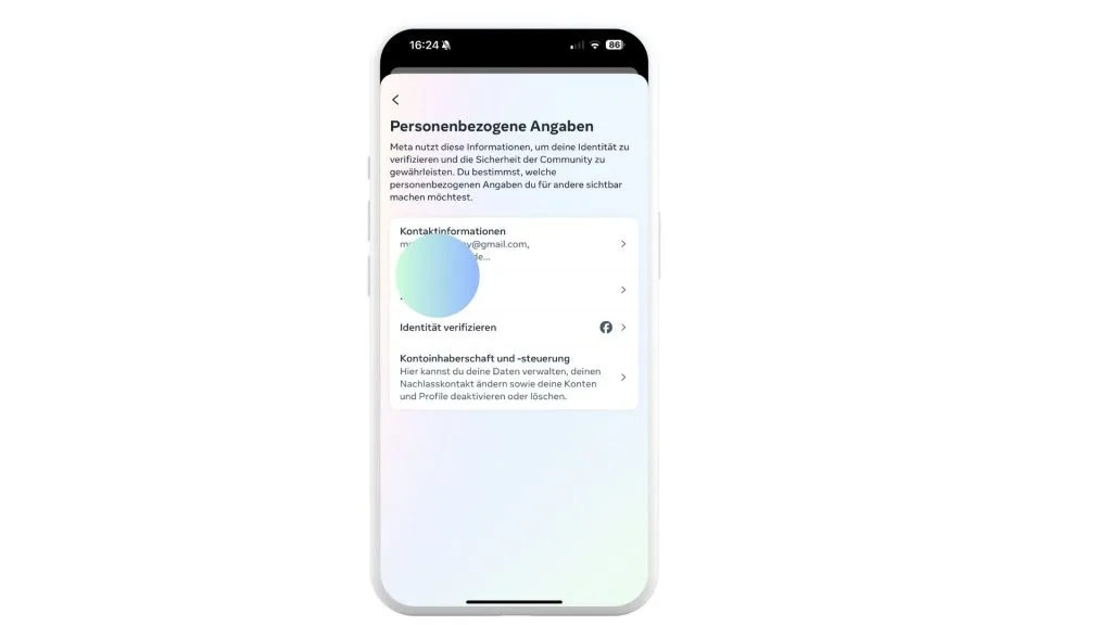 - Gehe zu „Meta Kontenübersicht“, dann tippe auf „Personenbezogene Angaben“ und wähle „Kontaktinformationen“.