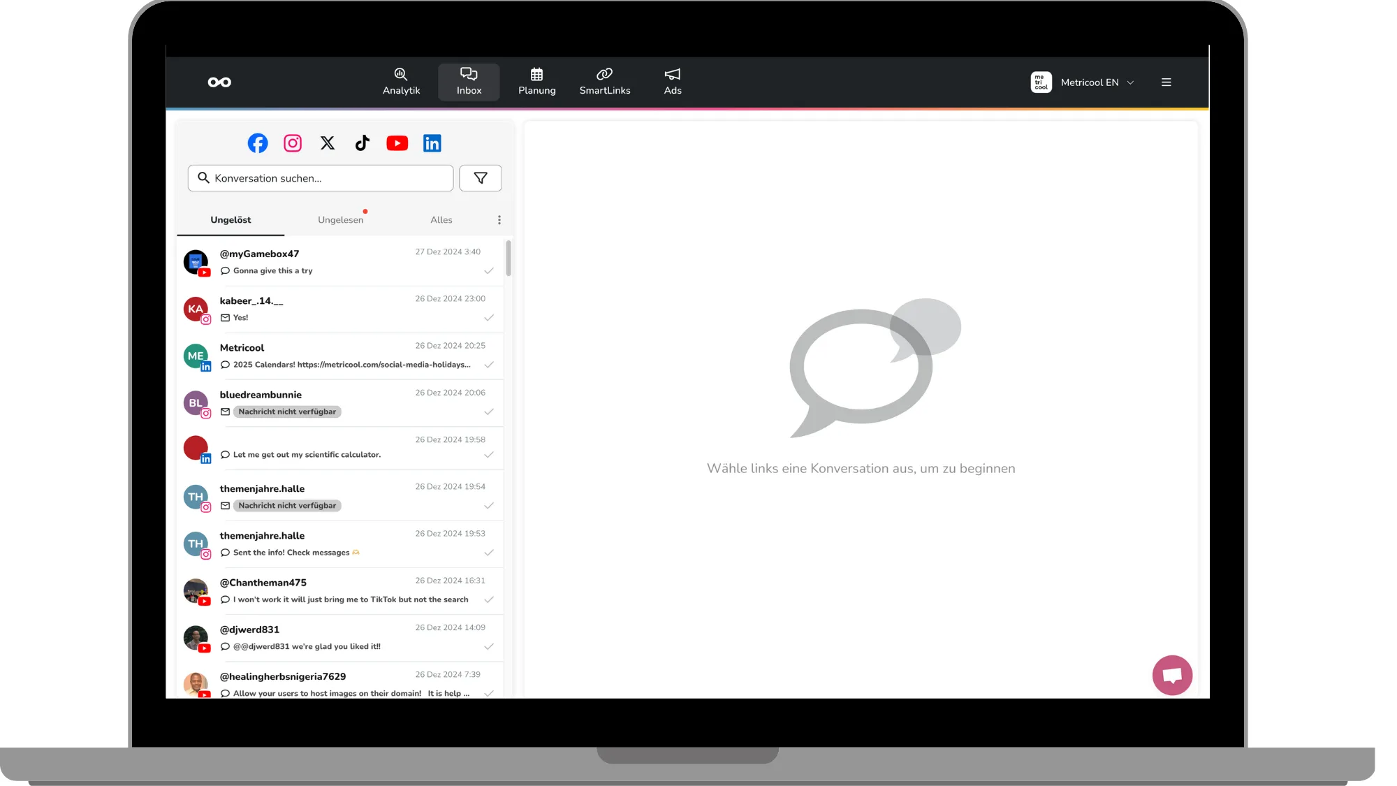 Das machst du am besten mit einem Social-Media-Management-Tool wie Metricool, mit dem du alle deine Social-Media-Accounts zentral verwalten kannst. Außerdem stellt dir Metricool eine einheitliche Inbox zur Verfügung, mit der du Nachrichten und Kommentare nicht nur auf Instagram beantworten kannst, sondern auch auf allen anderen Social-Media-Plattformen.