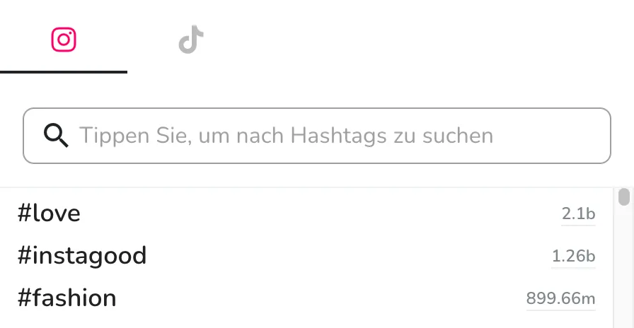 ✅ Wähle passende Hashtags aus: Klicke unten links auf # und gib anschließend ein Stichwort ein. Metricool zeigt dir alle relevanten Hashtags und wie beliebt sie momentan auf Instagram sind. Klicke auf die passenden, um sie zu deinem Beitrag hinzuzufügen.