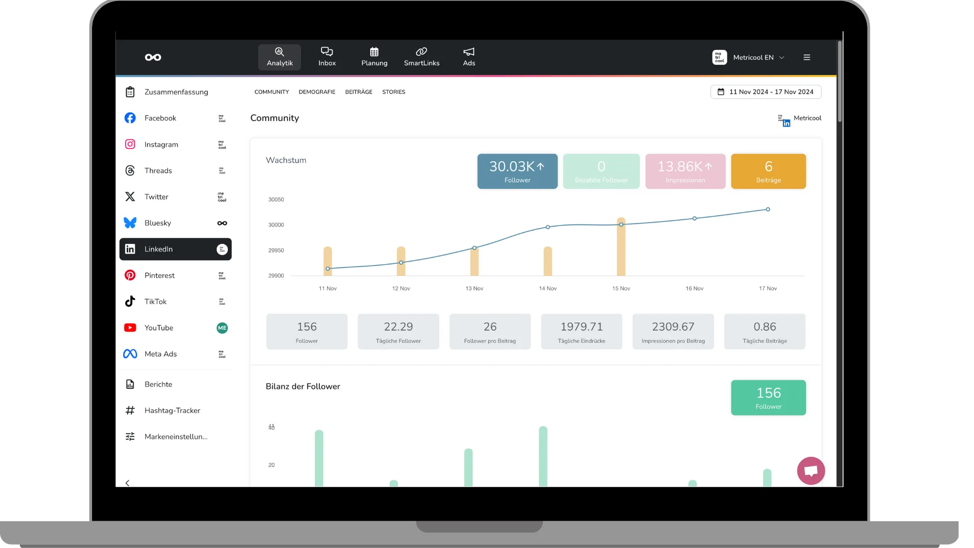 Momentan kannst du die 10 wichtigsten sozialen Netzwerke mit Metricool verwalten: Threads, TikTok, Instagram, Bluesky, Facebook, X, YouTube, Twitch, LinkedIn und Pinterest.