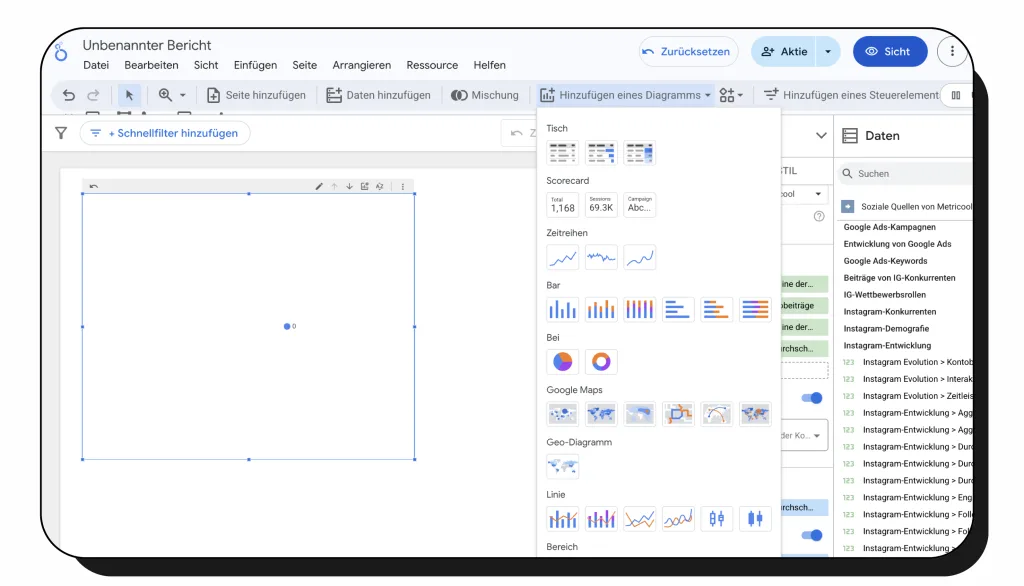 Looker Studio ist eine cloudbasierte Plattform zur Erstellung von Dashboards und interaktiven Berichten. Das Besondere: Du kannst Daten aus über 1.000 Quellen integrieren – darunter Google Analytics, Google Ads, YouTube, aber auch Drittanbieter wie Metricool.