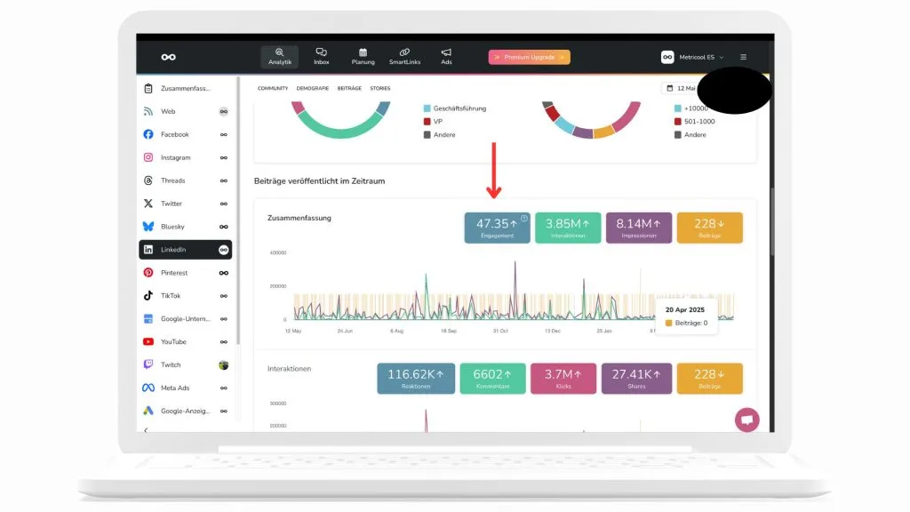 Sobald du dein LinkedIn-Konto mit Metricool verknüpft hast, findest du alle relevanten Metriken unter dem Menüpunkt „Analytik“: