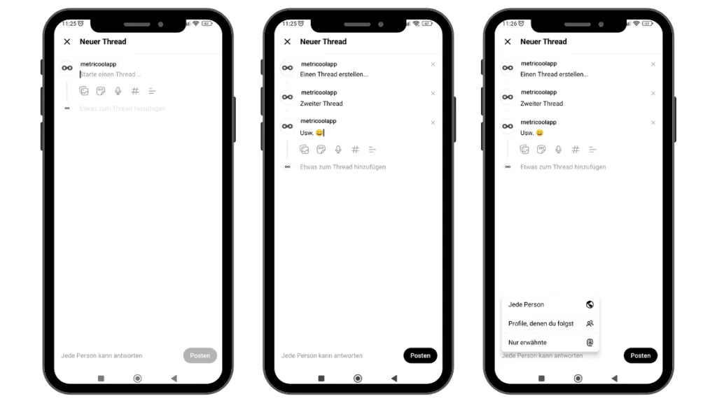 Wenn du bereit bist zu posten, wählst du einfach die Zielgruppe aus, die den Thread sehen kann (jeder, deine Follower, Profile, denen du folgst oder nur Erwähnte) und klickst auf „Posten”.